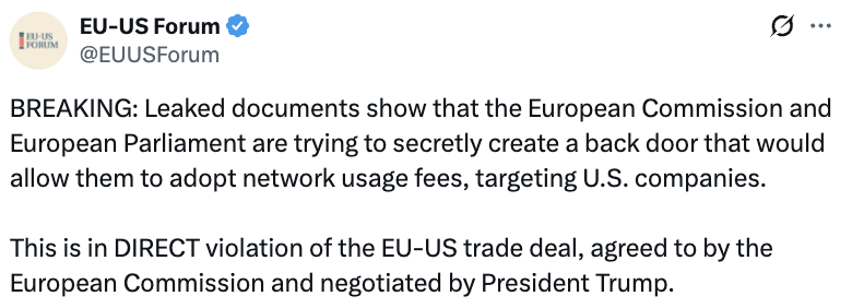 A leaked draft of the European Commission’s Digital Networks Act (DNA) suggests the Commission is keeping the door open for “network usage fees” through backdoor language, despite the EU’s commitment in last summer’s U.S.–EU trade framework that it “will not adopt or maintain network usage fees.