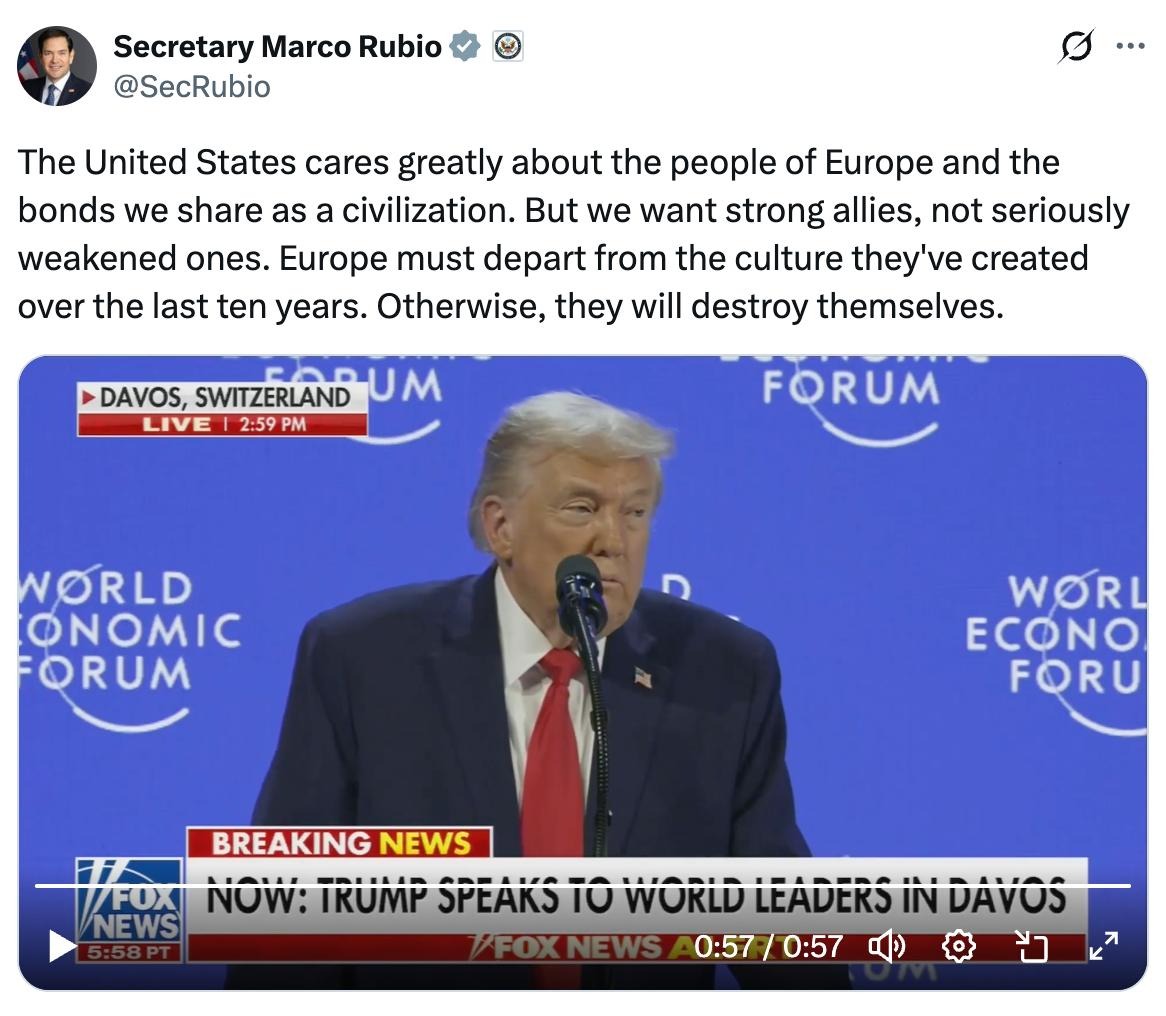 State Department Secretary Marco Rubio amplified the President’s message to Europe, posting on X: “The United States cares greatly about the people of Europe and the bonds we share as a civilization. But we want strong allies, not seriously weakened ones. Europe must depart from the culture they’ve created over the last ten years. Otherwise, they will destroy themselves.