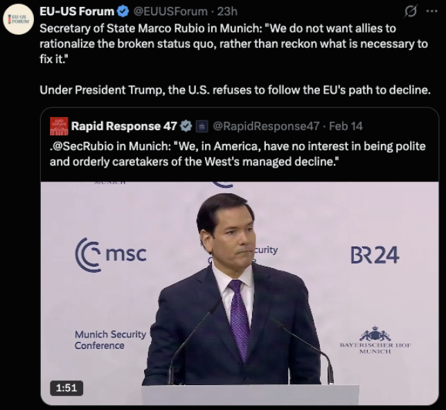 Last week at the Munich Security Conference, U.S. Secretary of State Marco Rubio delivered a clear message: our transatlantic unity only endures if Europe reasserts sovereignty, secures its borders, and rejects globalization.