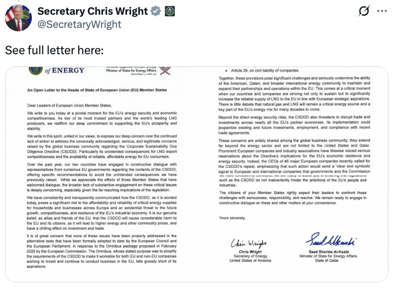 Energy Secretary Chris Wright sent a letter to EU heads of state warning that Brussels’ Corporate Sustainability Due Diligence Directive (CSDDD) would hike energy costs, chill investment, and export Europe’s ESG bureaucracy onto American companies. Secretary Wright cites “a significant risk to the affordability and reliability of critical energy supplies” and a likely “chilling effect on investment and trade.” The letter urges EU leaders to “act swiftly … by repealing the CSDDD in its entirety or removing its most economically damaging provisions.